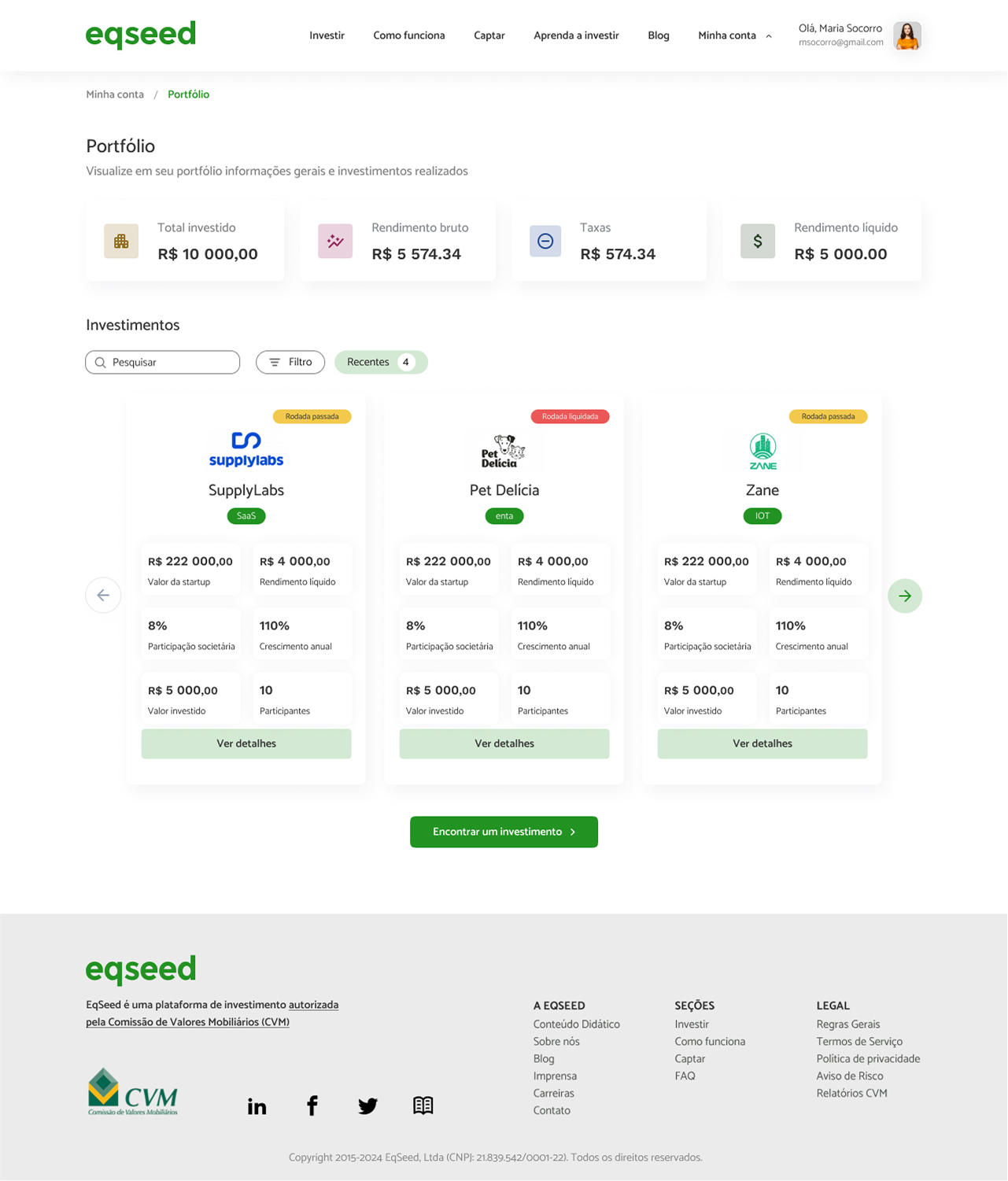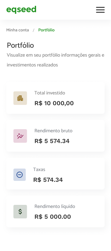 A empresa EqSeed é uma plataforma de investimentos em startups que oferece aos clientes a possibilidade de gerenciar seu portfólio de investimentos online.
