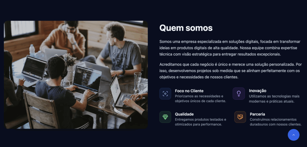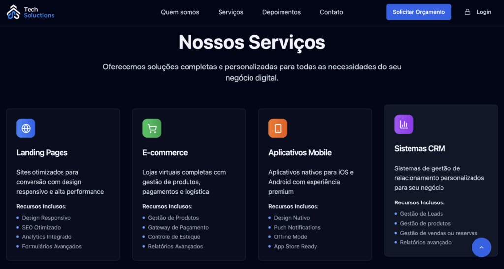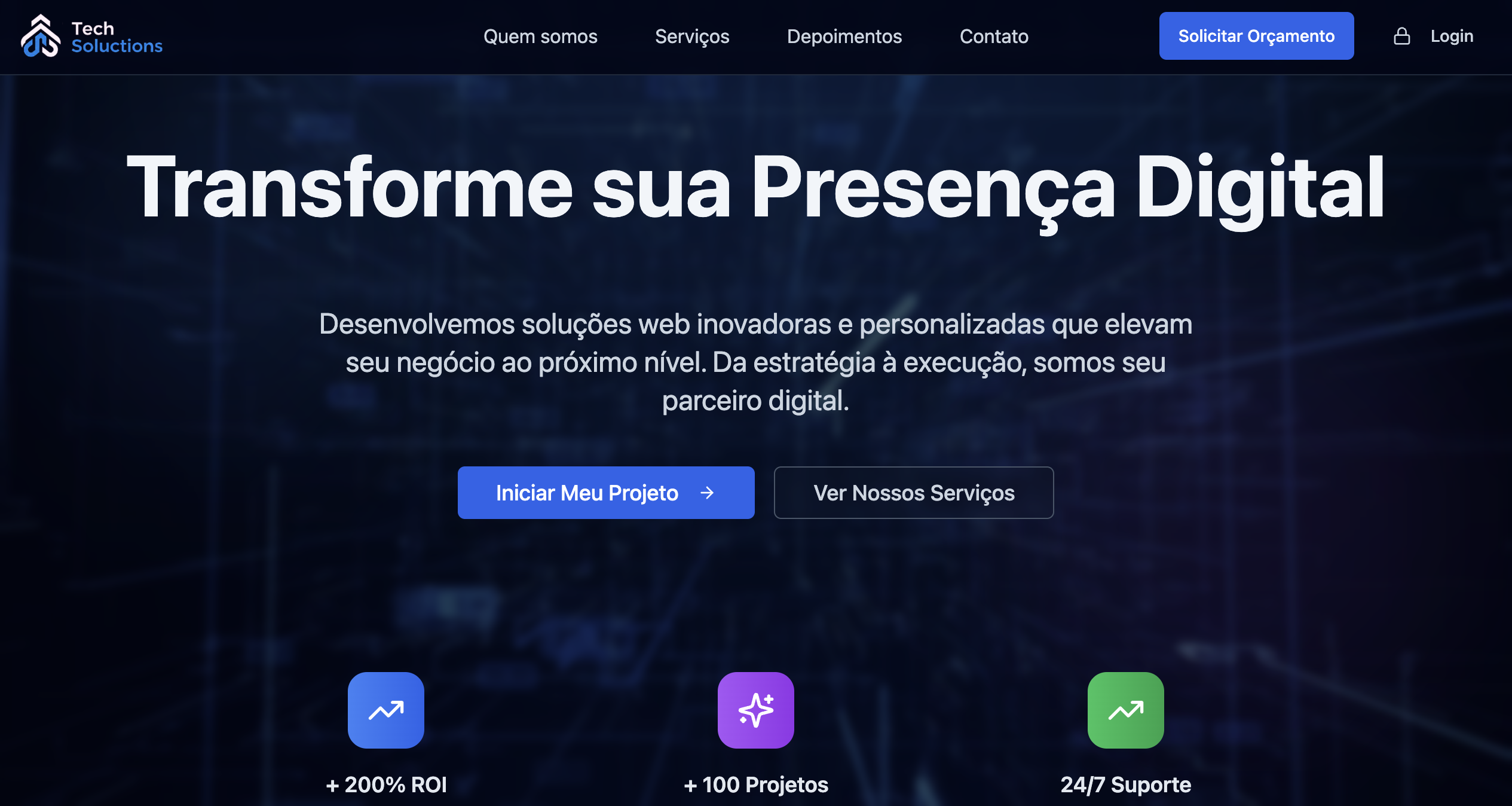 Tech Soluctions é um projeto fictício que remete a uma empresa especializada em soluções digitais, focada em transformar ideias em produtos digitais de alta qualidade.