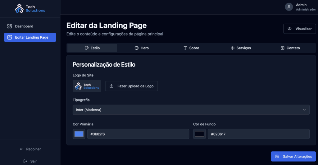 Neste projeto foi desenvolvido uma Landing Page com seções como Hero, Quem somos, Serviços, Testemunhas, FAQ e formulário para orçamento. No CRM com Login, Dashboard e para editar o estilo e seções da Landing Page.